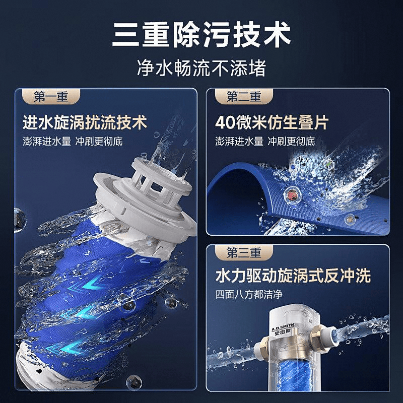 采用仿生叠片与深度除污技术,具备40微米高精度过滤,轻松去除铁锈和泥沙等杂质。这不仅提升了水质,还延长了家中用水设备的使用寿命。